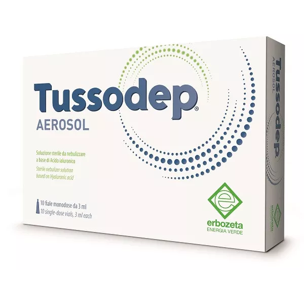 TUSSODEP AEROSOL è una soluzione sterile, senza conservanti e pronta all’uso, indicata per contrastare la sintomatologia conseguente ad alterazioni del trofismo dell’epitelio respiratorio (tosse, rinorrea, dolore) tipica delle sindromi influenzali ma anche legata ad allergeni. Alla base di queste condizioni vi è una riduzione della normale idratazione mucosale e una conseguente riduzione della clearance mucociliare. Questo provoca un circolo vizioso che può sfociare in ostruzione delle vie aeree e suscettibilità ad infezioni virali e batteriche. Pertanto la nebulizzazione di sostanze idratanti, come l’Acido ialuronico, è il corretto approccio terapeutico che ripristina il livello di idratazione, donando sollievo alla mucosa irritata. La soluzione ipertonica permette la fluidificazione e rimozione del muco.