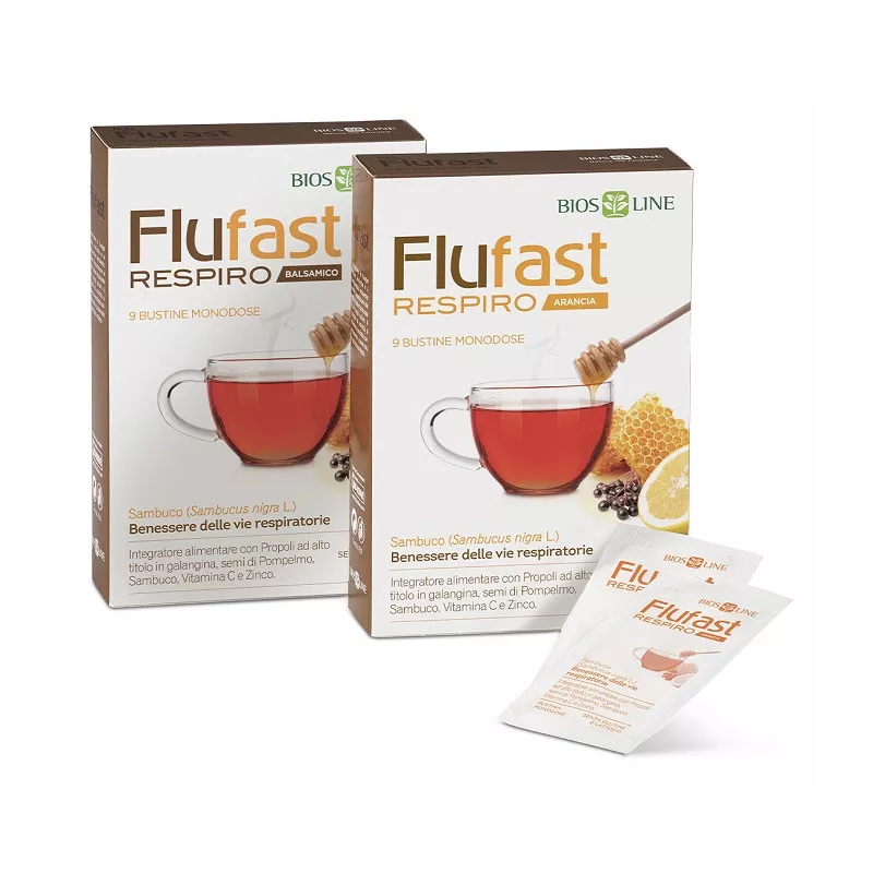 Contiene inoltre Sambuco, Miele, oli essenziali, Vitamina C e Zinco. L’estratto di Sambuco è utile per il benessere delle vie respiratorie e per favorire la fluidificazione delle secrezioni bronchiali. Gli oli essenziali di Eucalipto, Menta e Timo svolgono un’azione balsamica, emolliente e lenitiva contribuendo al benessere di naso e gola. La Vitamina C e lo Zinco sono utili alle normali funzioni del sistema immunitario. È un valido aiuto da prendere ai primi disturbi della stagione fredda, soprattutto in caso di naso chiuso e vie aeree congestionate: unisce all’efficacia dei suoi ingredienti i benefici di una bevanda calda. Flufast Respiro, infatti, è in pratiche bustine da sciogliere in acqua calda e bere subito per sfruttare al meglio le proprietà degli oli essenziali.