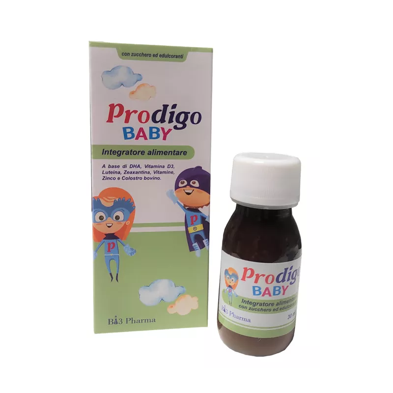 Descrizione Integratore alimentare a base di DHA, vitamina D3, luteina, zeaxantina, vitamine, zinco e colostro bovino.