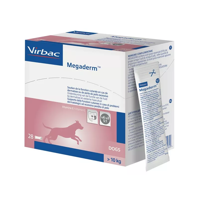 La formula concentrata e bilanciata di Megaderm permette l’apporto di quantità giornaliere elevate di AGE (acidi grassi essenziali) in conformità ai bisogni della cute dell’animale.