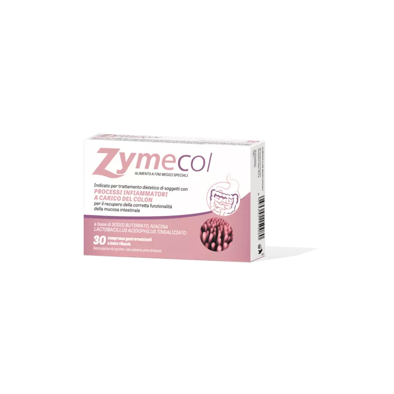 Per permettere al butirrato di sodio di raggiungere il tratto intestinale, le compresse di Zymecol sono state rivestite da un film gastroresistente composto da una miscela di etilcellulosa, ammonio idrossido, trigliceridi a media catena, acido oleico, sodio alginato e acido stearico.