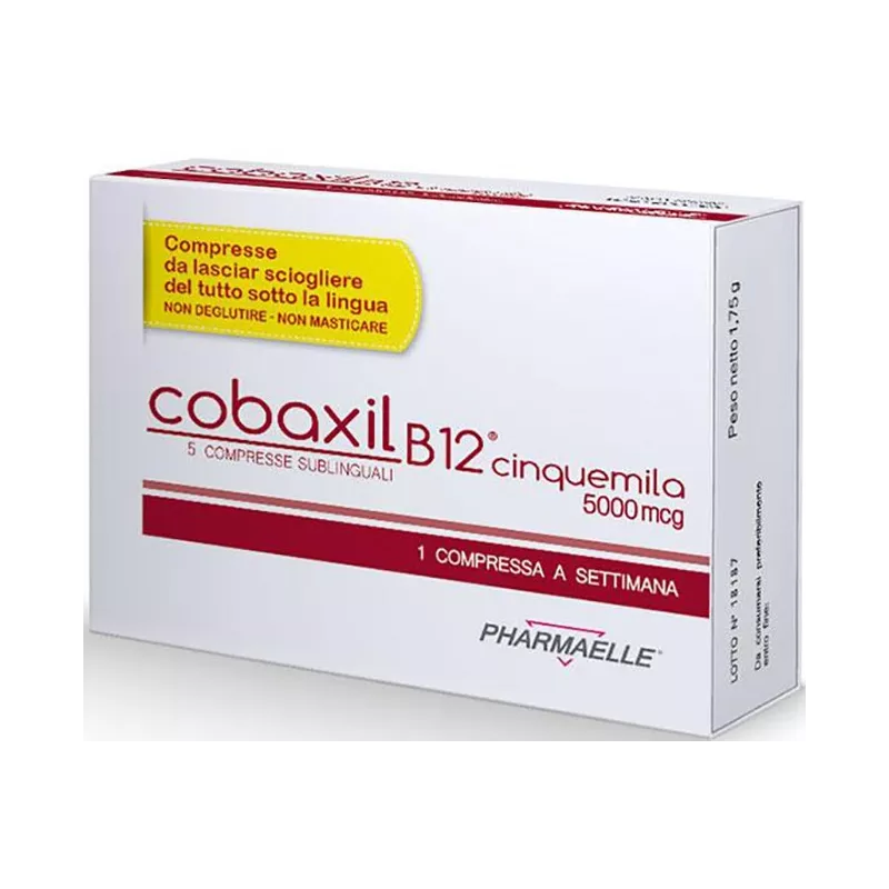 Cobaxil B12® cinquemila 5000 mcg è un prodotto contenente vitamina B12 ad alto dosaggio, indicato per gli stati carenziali gravi di cobalamina associati a ridotto assorbimento, aumentato fabbisogno e ridotto approvvigionamento mediato dalla dieta. La forma sublinguale, sfruttando una via di assorbimento differente rispetto a quella gastroenterica, garantisce il massimo assorbimento della vitamina B12 anche nei pazienti gastroresecati e con patologie infiammatorie del tratto gastrointestinale. L’utilizzo di Cobaxil B12® cinquemila aiuta a correggere efficacemente ed in maniera appropriata lo stato carenziale grave di vitamina B12 che può essere responsabile di anemia (sensazione di fatica e stanchezza generalizzata), livelli elevati di omocisteina, neuropatia e difficoltà cognitive. Cobaxil B12® cinquemila è sviluppato per ripristinare gli stati carenziali gravi di vitamina B12 (terapia d’attacco).