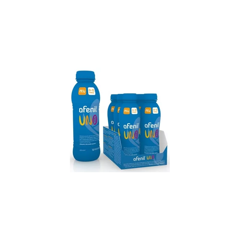Avvertenze Afenil Uno deve essere usato sotto controllo medico, da soggetti con accertata iperfenilalaninemia inclusa la fenilchetonuria. Afenil Uno può essere utilizzato come unica fonte di alimentazione. Il prodotto può comportare rischi per la salute se consumato da soggetti che non presentano il disturbo specifico per il quale è indicato. Tenere fuori dalla portata dei bambini. Non utilizzare per via parenterale. Non usare per via endovenosa.