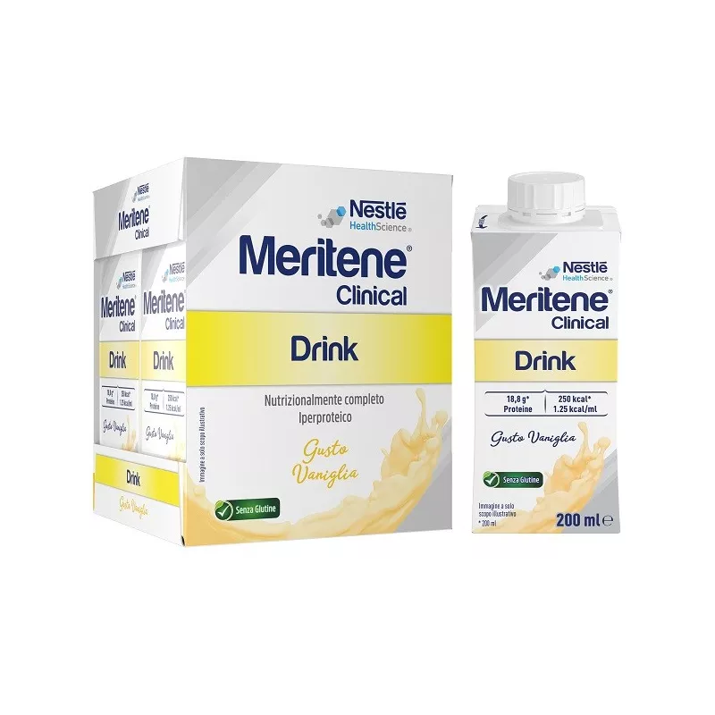 Descrizione Alimento a fini medici speciali. Nutrizionalmente completo. Iperproteico. MERITENE Clinical Drink è un alimento a fini medici speciali, caratterizzato da un elevato contenuto proteico e di carboidrati. Per questo motivo è indicato per la gestione dietetica della malnutrizione calorico-proteica, anche di pazienti sarcopenici.