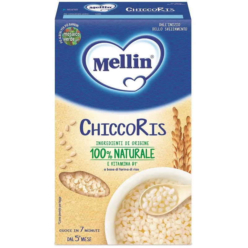 Risottini: far bollire 2 o 3 cucchiai di ChiccoRis per 7 minuti in abbondante acqua. Scolare e condire con un cucchiaio di olio extravergine d'oliva o con un vasetto di omogeneizzato di verdure Mellin.