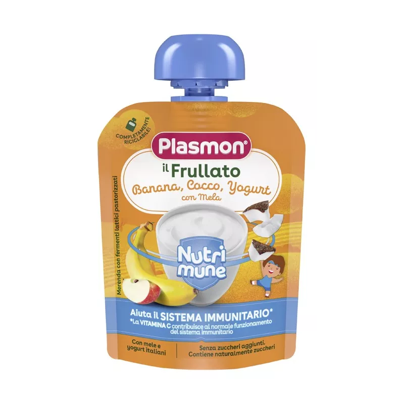 Merenda pastorizzata a base di banana, mela, cocco e yogurt con fermenti lattici pastorizzati.