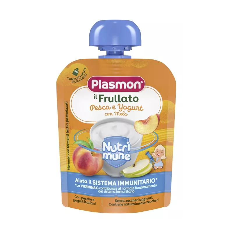 Merenda pastorizzata a base di pesca, mele e yogurt con fermenti lattici pastorizzati.