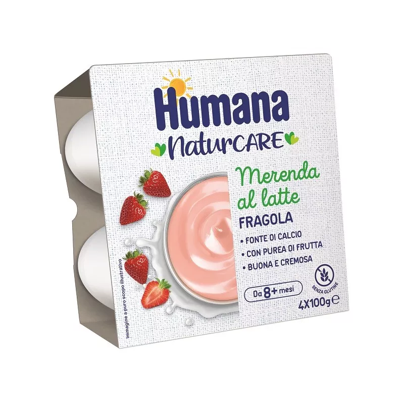 Descrizione Merenda al latte con purea di frutta, fonte di calcio.