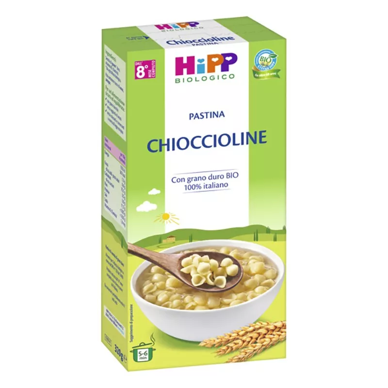 Modalità d'uso Per bambini dall'8° mese di vita, preparare 3-4 cucchiai di Chioccioline (circa 30 grammi). Durante lo svezzamento tale dose può essere aumentata a seconda dell'appetito e dell'età del bambino. Consultare eventualmente il parere del pediatra. Grazie alla loro formulazione, le Chioccioline hanno tempi di cottura molto rapidi e sono pronte in soli 5-6 minuti. Dopo la preparazione si consiglia di controllare la consistenza della pastina HiPP. Prolungare la cottura di un minuto se si preferisce una consistenza più morbida e a seconda dell'età del bambino.
