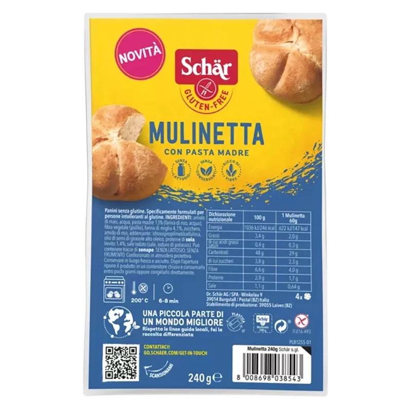 Descrizione Panini con pasta madre, ricco di fibre senza glutine, senza frumento, senza lattosio e senza uova.