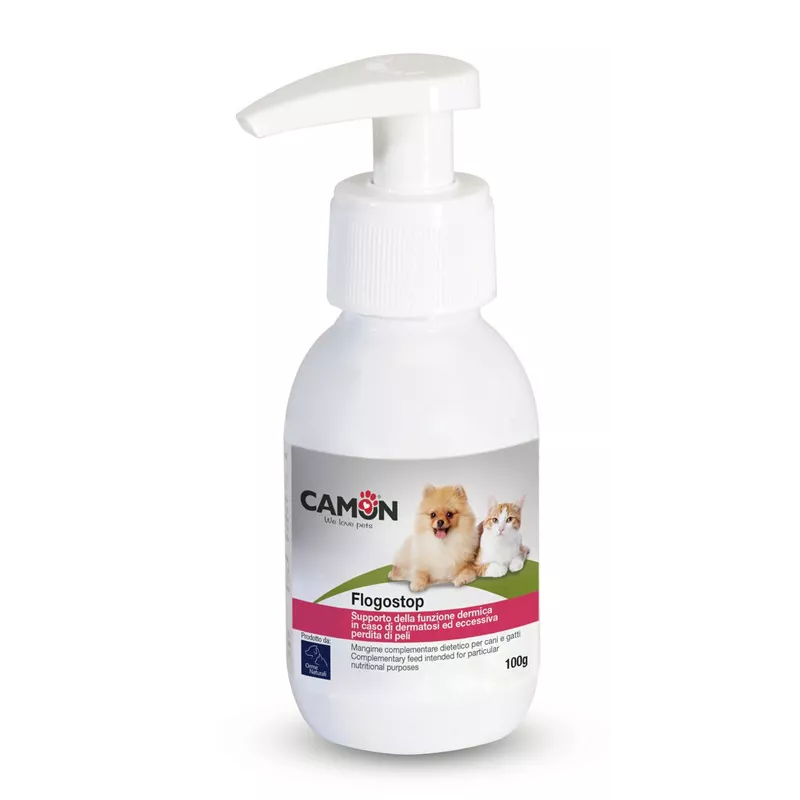 Mangime complementare dietetico per cani e gatti che agisce come supporto alla funzione dermica in caso di dermatosi ed eccessiva perdita di peli, arrossamento, prurito e cattivo odore della cute.