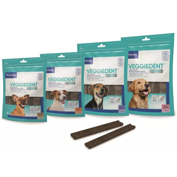 Prodotto innovativo per la salute del cavo orale del cane che non maschera l’alito cattivo, ma agisce sulle sue cause. Veggiedent FR3SH è caratterizzato da una formulazione con soli ingredienti naturali e vegetali, con ridotto apporto di calorie e dotato di ottima appetibilità. Il Veterinary Oral Health Council (VOHC) ha riconosciuto a Veggiedent FR3SH la caratteristica di controllare e prevenire la formazione di placca e tartaro.