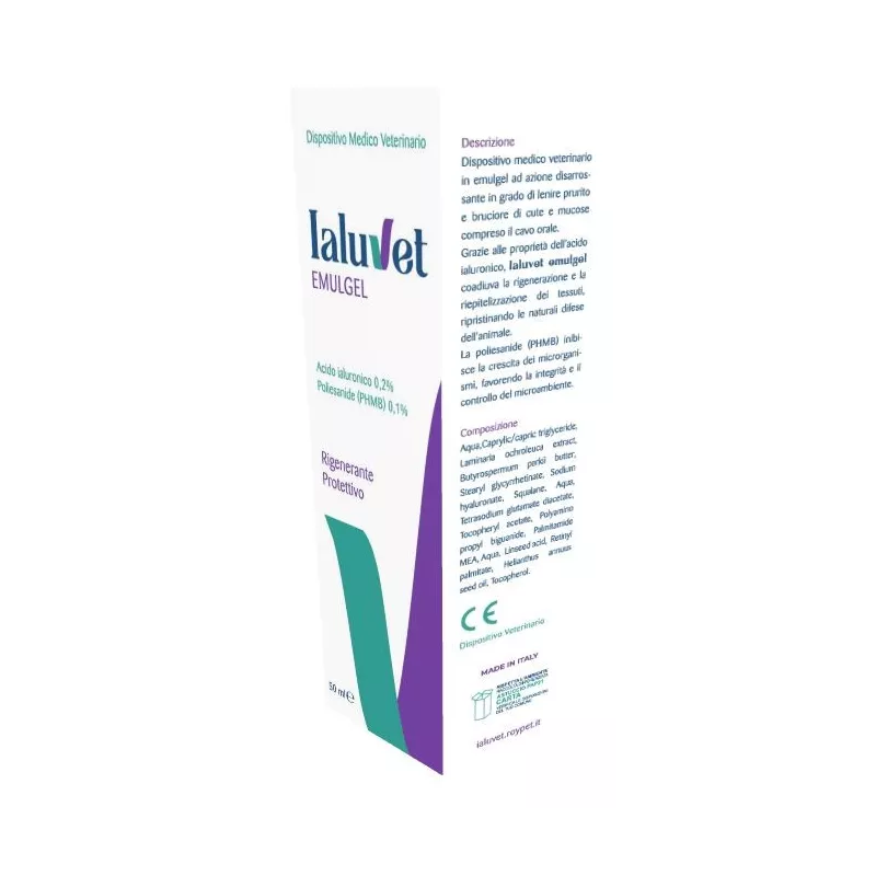 Dispositivo medico veterinario in emulgel ad azione disarrossante in grado di lenire prurito e bruciore di cute e mucose, compreso il cavo orale. Grazie alle proprietà dell'acido ialuronico, Ialuvet emulgel coadiuva la rigenerazione e la riepitelizzazione dei tessuti, ripristinando le naturali difese dell'animale. La poliesanide (PHMB) inibisce la crescita dei microrganismi, favorendo l'integrità e il controllo del microambiente.