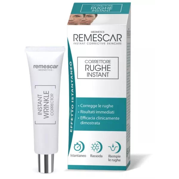 Remescar Correttore Rughe Instant è una crema a effetto immediato che agisce sulle rughe nell’area delicata del contorno occhi, tra le sopracciglia o intorno a bocca e naso con una sola applicazione al giorno. La sua tecnologia e-WRINK FLEX, basata su una combinazione unica di estratti di alghe rosse, minerali d’argilla, zuccheri vegetali e molecole naturali che proteggono dallo stress ossidativo, riempie le rughe donando istantaneamente alla pelle un aspetto più liscio e giovane.