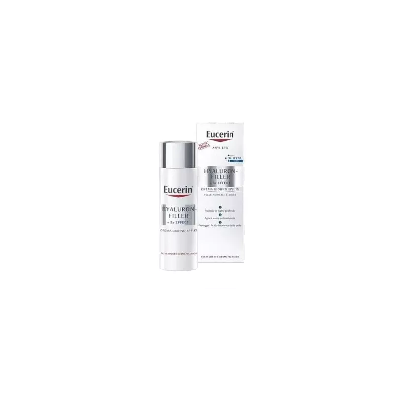 Eucerin Hyaluron-Filler Crema Giorno SPF 15 combatte i primi segni di invecchiamento della pelle mista. Rinfresca notevolmente le linee sottili e anche le rughe profonde per un aspetto ringiovanito. Previene efficacemente il fotoinvecchiamento indotto dai raggi UV (invecchiamento prematuro della pelle causato dal sole), l'aumento della profondità delle rughe e protegge la pelle dai radicali liberi.