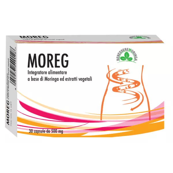 Descrizione Moreg è un integratore alimentare a base di moringa semi utile per la funzionalità digestiva, con frangula, rabarbaro e boldo utili per la regolarità del transito intestinale; tarassaco che sostiene le funzioni depurative dell'organismo, malva utile per il nomale volume e consistenza delle feci e finocchio utile per la regolare motilità gastrointestinale ed eliminazione dei gas.