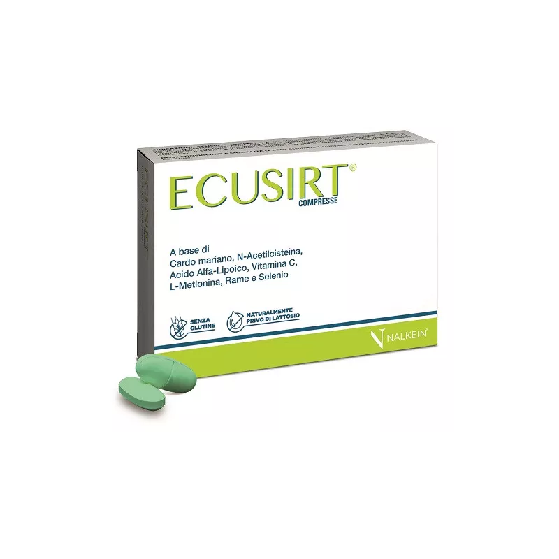 ECUSIRT® compresse è un complemento alimentare a base di Cardo Mariano, N-Acetilcisteina, Acido Alfa-Lipoico, Vitamina C, L-Metionina, Rame e Selenio. Il Cardo Mariano sostiene la funzione epatica e le funzioni depurative dell’organismo. La Vitamina C, il Selenio e il Rame contribuiscono alla protezione delle cellule dallo stress ossidativo.