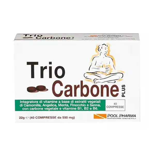 Integratore alimentare a base di carbone vegetale, estratti vegetali di camomilla, angelica, menta, finocchio, senna e vitamine B1, B2, B6.