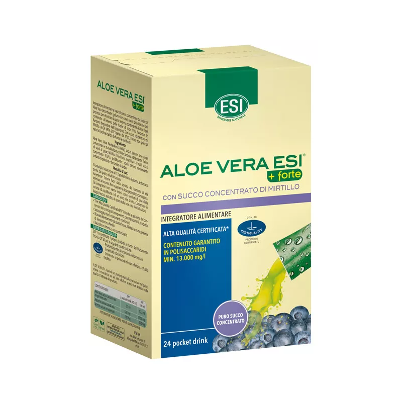 Ingredienti Aloe vera (Aloe barbadensis Miller) succo (gelum sine cute) concentrato e standardizzato, miele, aroma; addensante: farina di semi di guar; mirtillo (Vaccinium myrtillus L.) frutti succo concentrato (0,3%); acidificante: acido citrico; conservanti: sorbato di potassio e benzoato di sodio.