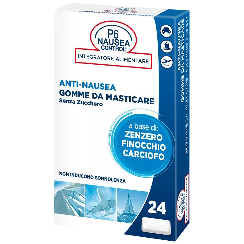Descrizione Gomme da masticare allo zenzero P6 Nausea Control. Possono essere impiegate in caso di nausea oltre che per difficoltà digestive. Con zenzero utile come antinausea, estratto di finocchio e carciofo utili per la funzione digestiva ed olio di menta piperita. Hanno un sapore gradevole. Non inducono sonnolenza. Senza zucchero. Con edulcoranti.