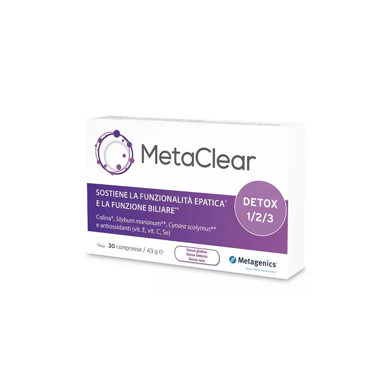 Ingredienti L-glicina; agente di carica: idrossipropilcellulosa; citrato di potassio, bitartrato di colina; agenti di carica: cellulosa microcristallina e fosfati di calcio; N-acetil-cisteina, estratto secco di crescione (Nasturtium offcinale R. Brown), taurina, estratto secco di melograno (Punica granatum L.), estratto secco di cardo mariano [Silybum marianum (L.) Gaertn], vitamina C (ascorbato di magnesio), estratto di carciofo (Cynara scolymus L.), acido alfa-lipoico, (sale di sodio); agente antiagglomerante: acido stearico, estratto secco di tè verde [Camellia sinensis (L.) Kuntze], solfato di sodio; agente antiagglomerante: carbossimetilcellulosa di sodio reticolata; L-treonina, L-lisina HCl; agenti antiagglomeranti: biossido di silicio e sali di magnesio degli acidi grassi; vitamina E (acetato di D-alfa-tocoferile); agente di carica: carbonato di magnesio; citrato di zinco, L-glutatione ridotto, vitamina B5 (pantotenato di calcio), vitamina B3 (nicotinamide, acido nicotinico), L-cisteina HCl, vitamina B6 (piridossal-5-fosfato), citrato di manganese, vitamina B1 (mononitrato di tiamina), vitamina B2 (riboflavina); agente di carica: fosfato bicalcico; citrato di rame, vitamina A (retinilpalmitato), folato (L-metilfolato di calcio), molibdato di sodio, L-selenometionina, biotina, vitamina D (colecalciferolo), vitamina B12 (metilcobalamina)