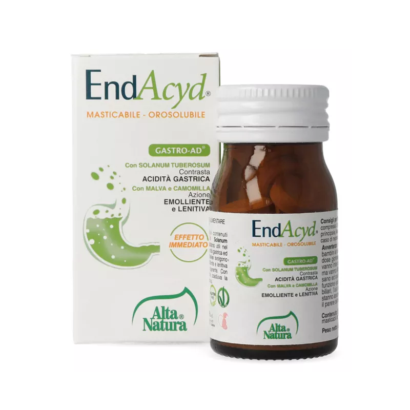 Calcio carbonato; agente di carica: amido, mannitolo; sodio bicarbonato, Gastro-Ad [soia fermentata (Glycine max L. Merr. semen) da Lactobacillus delbrueckii R-187, contiene soia e suoi derivati], magnesio idrossido, malva (Malva sylvestris L. folium) e.s. E/D:1/4, camomilla (Matricaria chamomilla L. capitula) e.s. tit. 0,3% apigenina; agente di carica: maltodestrine; edulcorante: aroma; agente di carica: idrossipropilcellulosa; antiagglomerante: biossido di silicio; curcumina da Curcuma longa; coadiuvante tecnologico: sale di magnesio degli acidi grassi. Solanum tuberosum (Solanum tuberosum L. tuber) e.s. tit. 5% PI2 (inibitori delle proteinasi); edulcorante: sucralosio.