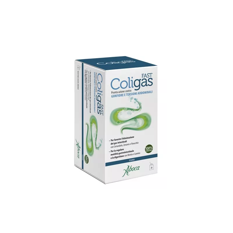 Descrizione Integratore alimentare utile in caso di gonfiore addominale spesso associato a fastidiose tensioni che possono essere avvertite subito dopo i pasti o durante la giornata. L'esclusiva formulazione si contraddistingue per la sinergia di coriandolo, zenzero e finocchio che sono utili per favorire l'eliminazione dei gas intestinali. Inoltre lo zenzero unito al cumino e la menta supportano la regolare motilità gastrointestinale e coadiuvano la digestione. ColiGas Fast tisana, è particolarmente gradevole anche senza l'aggiunta di zucchero, grazie alla presenza dell'olio essenziale di finocchio. ColiGas Fast è un integratore alimentare naturale e biodegradabile al 100%, non contiene sostanze di sintesi, emi- sintesi o geneticamente modificate.