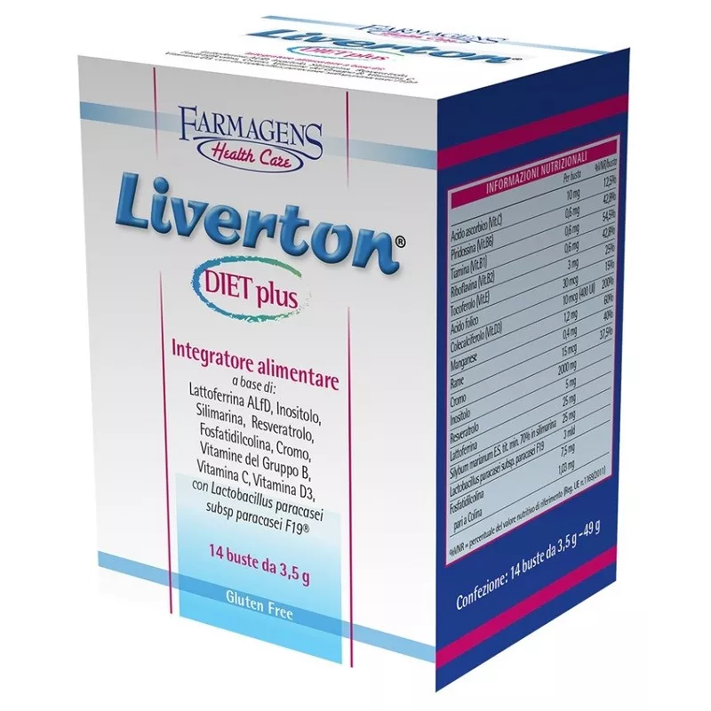 Descrizione Integratore alimentare a base di lattoferrina ALfD, inositolo, silimarina, resveratrolo, fosfatidilcolina, cromo, vitamine del gruppo B, vitamina C, vitamina D3, con Lactobacillus paracasei subsp. paracasei F19.