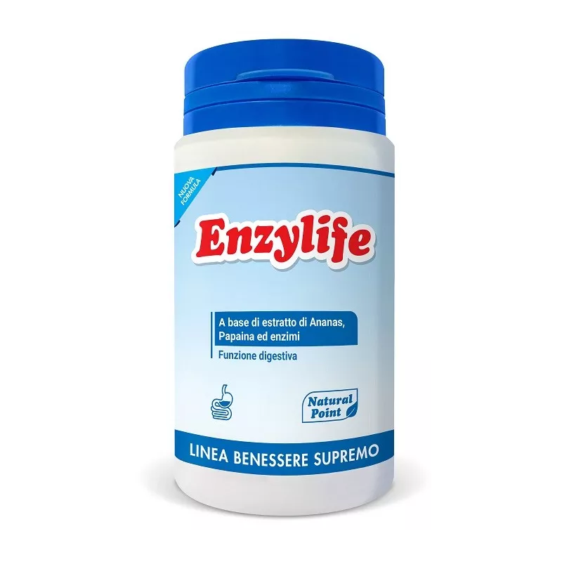 Ingredienti Ananas [Ananas comosus (L.) Merr., stipite, maltodestrine] e.s. tit. bromelina 250 GDU/g, papaina 100 TU/mg (da Carica papaya L. lattice, maltodestrine), complesso enzimatico da substrati vegetali fermentati (amilasi 8.000 SKB/g, lattasi 8.000 ALU/g, lipasi 600 FIP/g, cellulasi 300 CU/g; agenti antiagglomeranti: fosfato dicalcico, carbonato di calcio, biossido di silicio; maltodestrine); agente di rivestimento (capsula): idrossipropilmetilcellulosa; stabilizzante: mono e digliceridi degli acidi grassi.