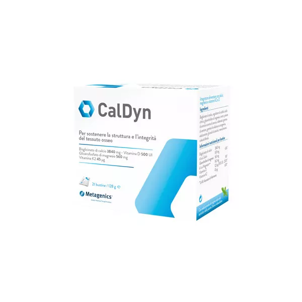 Descrizione Integratore alimentare con calcio, magnesio e vitamine k2 e D, con edulcorante di origine naturale estratto dalla pianta Stevia rebaudiana. È una formula completa a base di calcio utile per supportare la salute delle ossa. Come sale di calcio si impiega il bisglicinato di calcio. È dimostrato che questa forma di calcio viene utilizzata dall'organismo e presenta una buona tollerabilità gastrointestinale. Oltre al calcio CalDyn contiene magnesio, vitamine D e K2, indicate per la loro azione sinergica in grado di sostenere il metabolismo osseo.