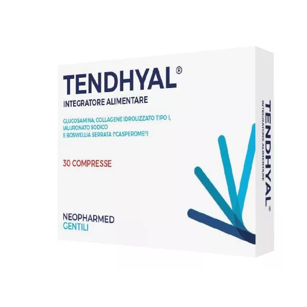Descrizione Integratore alimentare per la salute dei tendini e delle articolazioni a base di glucosamina, collagene idrolizzato tipo I, ialuronato sodico, boswellia serrata. I tendini, anatomicamente simili a cordoni, e composti di tessuto connettivo fibroso, sono elementi utili a congiungere i muscoli alle ossa, o ad altre strutture di inserzione. I tendini sono composti intimamente da collagene, in combinazione con mucopolisaccaridi ed elastina. Il compito principale dei tendini è la trasmissione della forza muscolare alle strutture a cui sono connessi. Resistenza ed elasticità consentono ai tendini di adattarsi ai diversi carichi di lavoro a cui vengono sottoposti. Tendhyal è un integratore composto da glucosamina, collagene idrolizzato tipo I, ialuronato sodico e boswellia serrata (Casperome), componenti di utilità per un fisiologico mantenimento della struttura e della funzione tendinea.