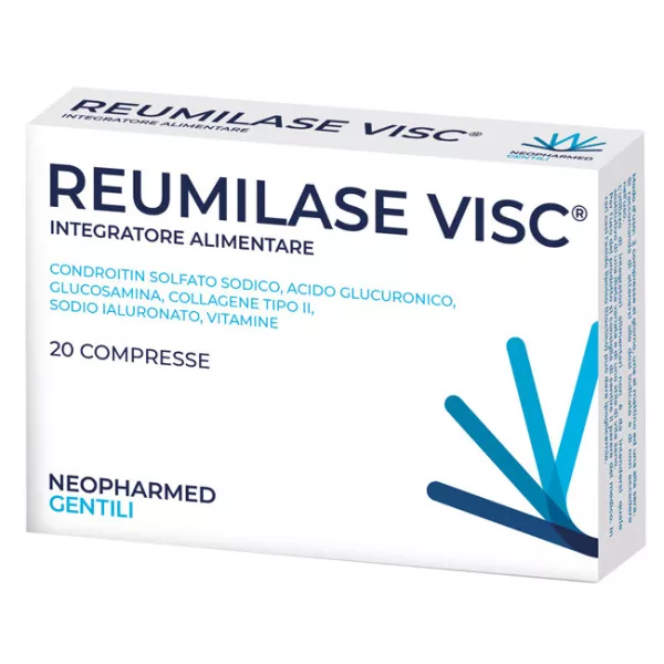 Descrizione Integratore alimentare per la funzionalità delle articolazioni a base di condroitin solfato sodico, acido glucuronico, glucosamina, collagene tipo II, sodio ialuronato e vitamine. Reumilase visc contiene alcuni componenti fisiologici della cartilagine: condroitin solfato sodico, acido glucuronico e glucosamina (componenti della parte glucidica dei proteoglicani della cartilagine). I proteoglicani sono costituiti da proteine e glicosaminoglicani che, richiamando acqua, formano un gel denso e viscoso in grado di conferire elasticità e lubrificazione. Reumilase visc contiene inoltre sodio ialuronato (componente del liquido sinoviale) componente fisiologico che svolge un ruolo funzionale e strutturale nelle articolazioni; collagene tipo II, che rappresenta il 10-20% della cartilagine integra, vitamina C che contribuisce alla normale formazione del collagene per la normale funzione delle cartilagini e vitamina E che contribuisce alla protezione delle cellule dallo stress ossidativo.