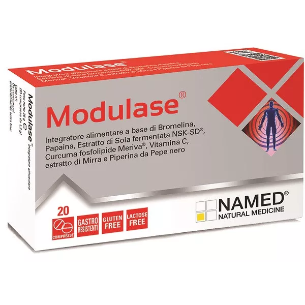 Descrizione Integratore alimentare a base di bromelina, papaina, estratto di soia fermentata NSK-SD, curcuma fosfolipide meriva, vitamina C, estratto di mirra e piperina da pepe nero.