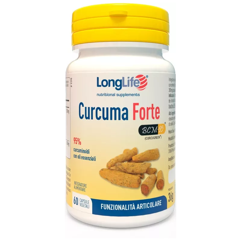 Ingredienti BCM-95 curcuma rizoma estratto secco alcolico tit. 95% complesso di curcuminoidi di cui: 86% curcuminoidi (metodo HPLC), 65% curcumina (metodo HPLC), 9% oli essenziali (metodo UV); curcuma rizoma estratto secco alcolico titolato 95% curcuminoidi (metodo HPLC), agente di carica (cellulosa microcristallina), antiagglomeranti (magnesio stearato vegetale e biossido di silicio), addensante (carbossimetilcellulosa di sodio). Capsula di origine vegetale in idrossipropilmetilcellulosa.