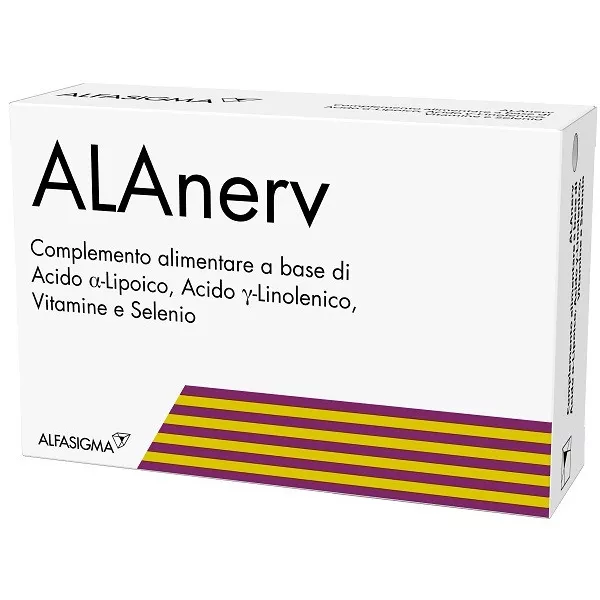 Descrizione Complemento alimentare a base di acido alfa-lipoico, acido gamma-linolenico, vitamine e selenio. La composizione di ALAnerv è una combinazione di acido alfa-lipoico, acido gamma-linolenico, vitamine del gruppo B, vitamina E e selenio. Le vitamine B1, B2 e B6 contribuiscono al normale funzionamento del sistema nervoso. La vitamina E ed il selenio contribuiscono alla protezione delle cellule dallo stress ossidativo.