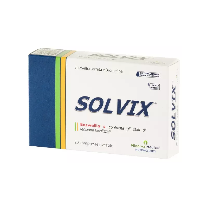 Descrizione SOLVIX è un integratore alimentare a base di Boswellia serrata e bromelina utile nei casi di ridotto apporto con la dieta o di aumentato fabbisogno di tali nutrienti. La Boswellia serrata contrasta gli stati di tensione localizzati e favorisce la funzionalità articolare.