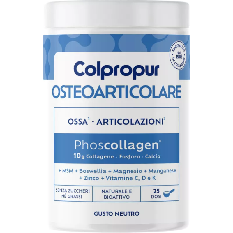 Integratore alimentare a base di Phoscollagen® (composto assimilabile formato da collagene, contenente naturalmente calcio e fosforo), MSM, Boswellia, vitamine e minerali, utile in caso di disturbi a carico dell’apparato musculo-scheletrico (perdita di massa ossea e usura delle articolazioni) che accelerano con l’età e con attività fisica intensa e che sono causati dal deterioramento della proteina collagene. L'azione sull'apparato muscolo-scheletrico di Colpropur OSTEOARTICOLARE si basa principalmente sulle proprietà di un ingrediente esclusivo: il Phoscollagen®, composto da peptidi bioattivi di collagene idrolizzato Colpropur D® e fosfato di calcio, dosati nella corretta proporzione necessaria per mantenere ossa sane. La formula specifica di Colpropur OSTEOARTICOLARE aiuta a: - stimolare e supportare la produzione di collagene per ossa, cartilagini e muscoli; - mantenere ossa normali, sane e forti; - rinforzare e mantenere la funzionalità delle articolazioni; - ridurre stanchezza e affaticamento.