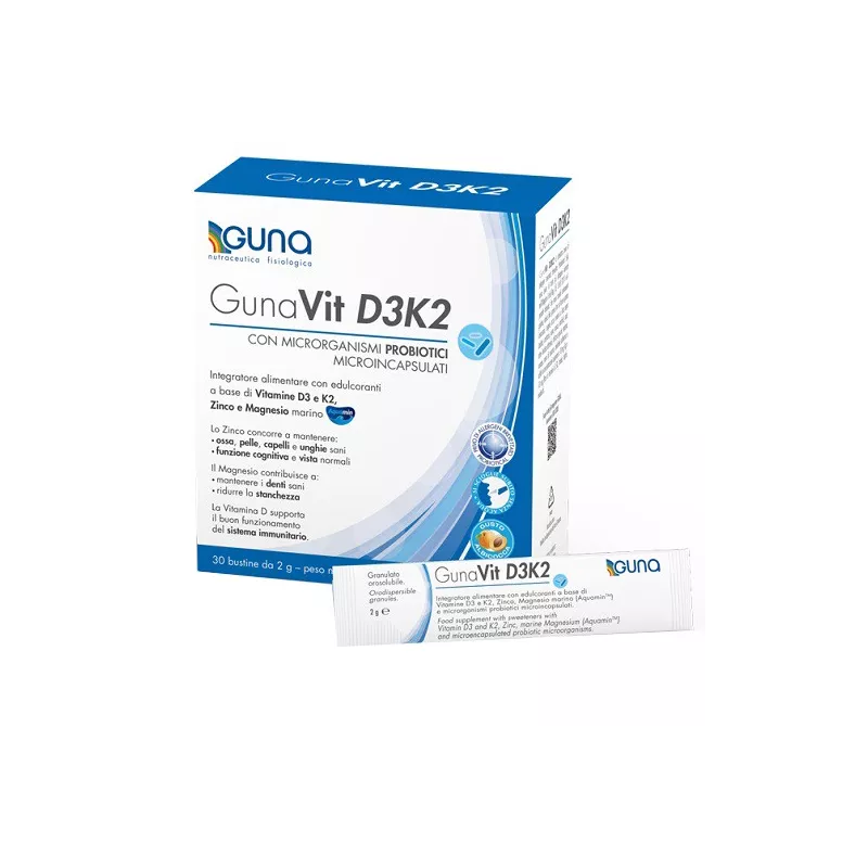 Contiene 2 diversi microrganismi probiotici appartenenti al genere Lactobacillus utili a favorire l'equilibrio della flora intestinale. Grazie all’impiego di un processo produttivo brevettato, i 2 microrganismi probiotici contenuti in GunaVit D3K2 si presentano in forma microincapsulata e gastroprotetta. L’impiego di questa tecnologia migliora decisamente la capacità di sopravvivenza di tutti i microrganismi probiotici durante il transito gastroduodenale, consentendo in tal modo il raggiungimento dell’intestino da parte di un elevato numero di microrganismi vivi e vitali.