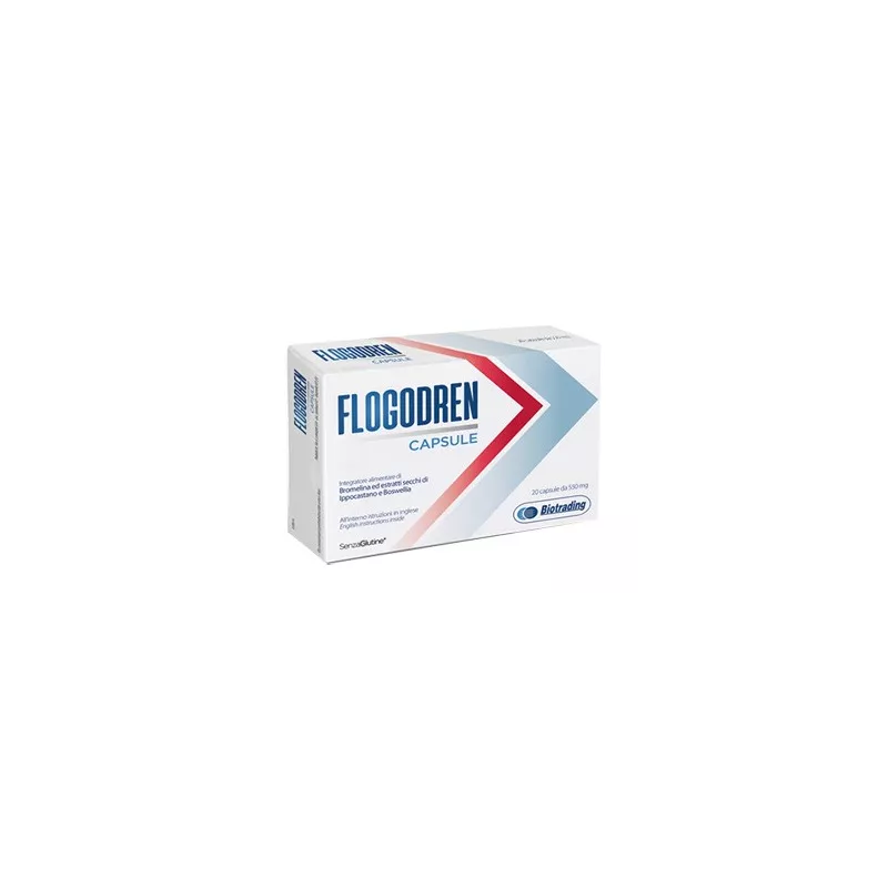 Flogodren capsule è un integratore alimentare con efficace azione antinfiammatoria ed antiedemigena a base di bromelina da ananas, escina da ippocastano e boswellia serrata resina. La bromelina è un enzima ad attività proteolitica estratto dal gambo dell'ananas. Viene assorbito a livello intestinale e possiede una spiccata azione antinfiammatoria e antiedemigena in grado di ridurre l'edema tissutale e per questo viene usato per decongestionare i tessuti molli. (Post chirurgia, traumi, malattie infiammatorie articolari, contusioni e distorsioni).