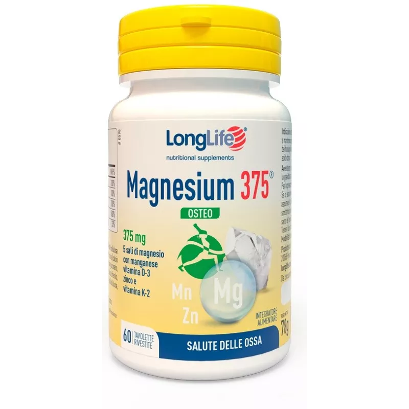 Ingredienti Magnesio ossido, stabilizzante (sorbitolo), addensante (cellulosa microcristallina), antiagglomerante (magnesio stearato vegetale), agente di carica (calcio fosfato bibasico), magnesio carbonato, magnesio citrato, magnesio gluconato, magnesio succinato, manganese gluconato, zinco ossido, colecalciferolo, menachinone-7 K2VITAL, agenti di rivestimento (idrossipropilmetilcellulosa, idrossipropilcellulosa, calcio carbonato e talco).