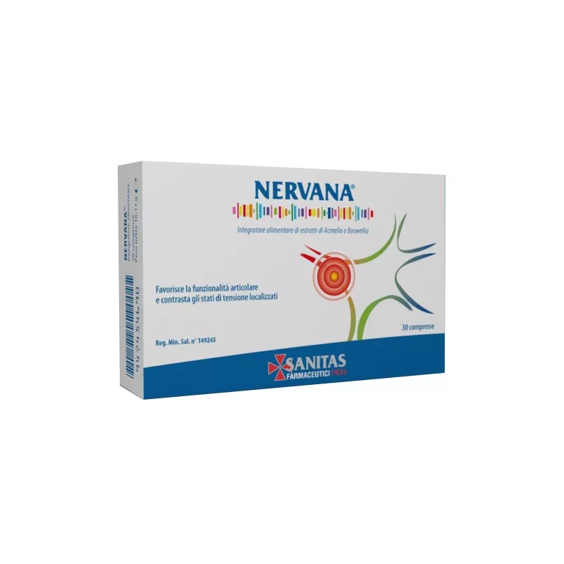 Descrizione Integratore alimentare naturale, con formulazione brevettata, a base di estratti titolati di Acmella oleracea e Boswellia serrata. La formulazione gastro-protetta di NERVANA consente il passaggio della compressa nello stomaco senza produrre alcun e ffetto indesiderato.