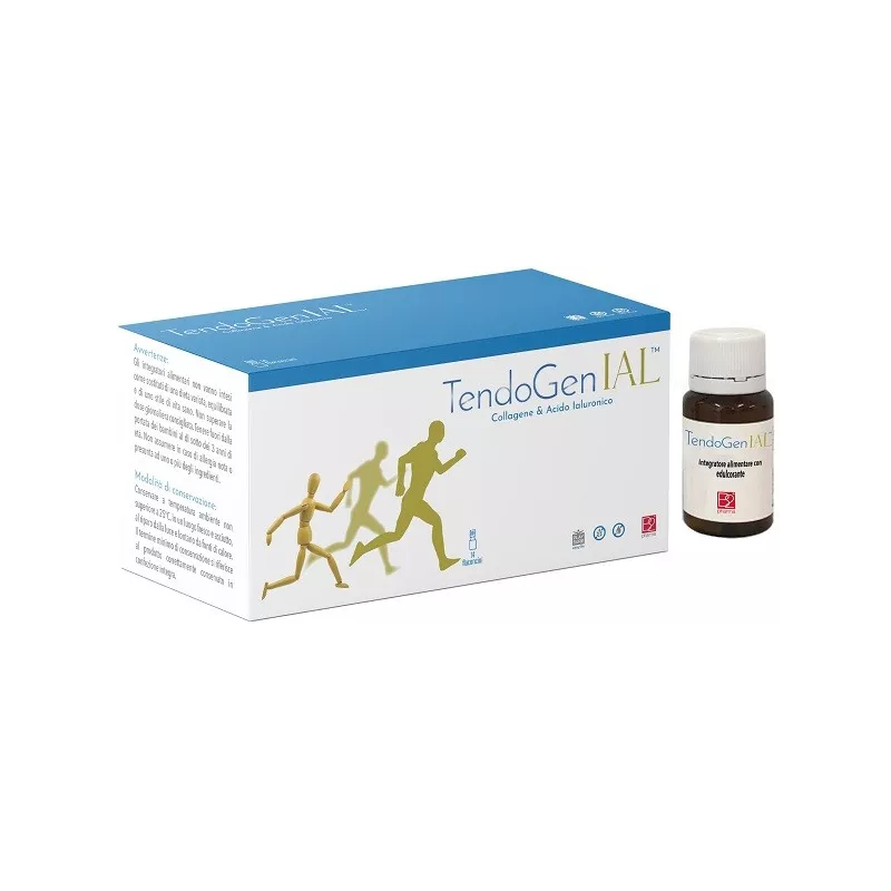 Descrizione Integratore alimentare a base di collagene e acido ialuronico con vitamina C e manganese.