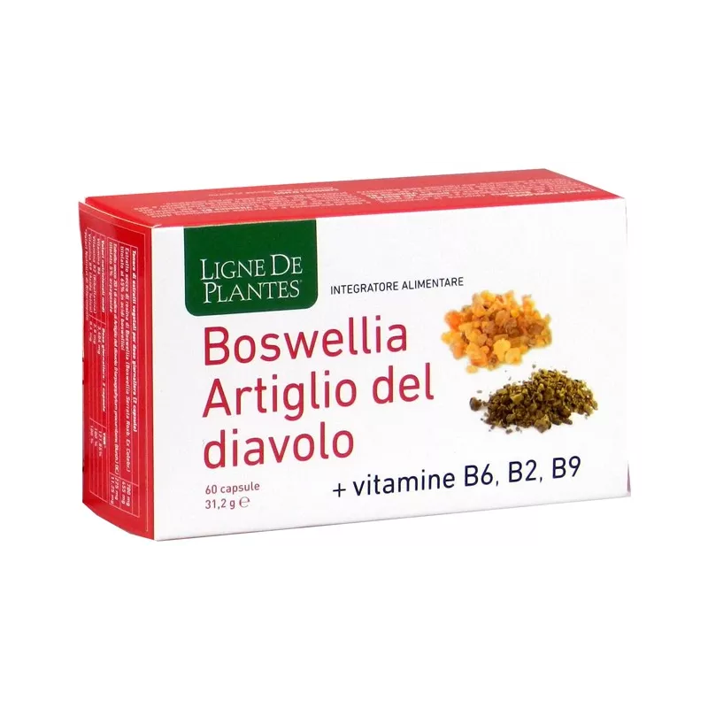 Ingredienti Estratto secco 5:1 di resina di boswellia (Boswellia serrata Roxb. ex Colebr.) titolato al 65% in acidi boswellici; estratto secco 20:1 di radice di artiglio del diavolo [Harpagophytum procumbens (Burch.) DC.] titolato al 5% in arpagoside; cellulosa microcristallina; antiagglomerante: stearato di magnesio; vitamina B6; vitamina B2 (riboflavina); vitamina B9 (acido folico); capsula vegetale di tipo 00.