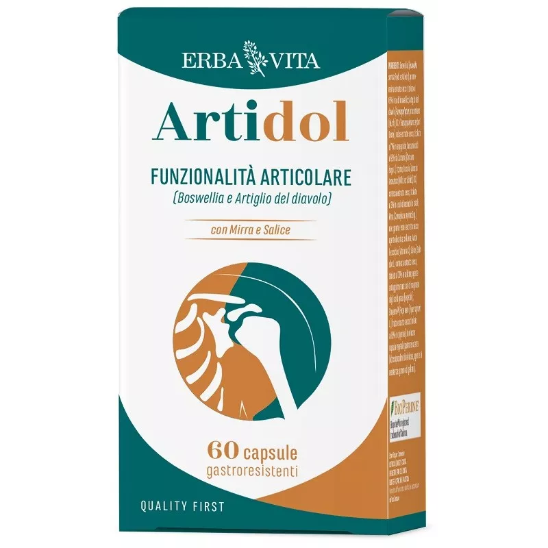 Ingredienti Boswellia (Boswellia serrata Roxb. ex Colebr.) gommoresina estratto secco titolato al 65% in acidi boswellici, artiglio del diavolo [Harpagophytum procumbens (Burch.) DC./Harpagophytum zeyheri Decne.] radice estratto secco, titolato all’1% in arpagoside, curcuminoidi al 95% da curcuma (Curcuma longa L.) rizoma, Uncaria [Uncaria tomentosa (Willd. ex Schult.) DC.] corteccia estratto secco, titolato al 3% in alcaloidi ossindolici totali, mirra (Commiphora myrrha Eng.) oleo-gommo-resina estratto secco; agente di carica: cellulosa; acido L-ascorbico (vitamina C), salice (Salix alba L.) corteccia estratto secco, titolato al 30% in salicina; agente antiagglomerante: sali di magnesio degli acidi grassi (vegetale), Bioperine [pepe nero (Piper nigrum L.) frutto estratto secco titolato al 95% in piperine].