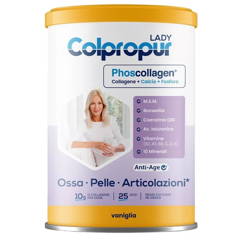 Ingredienti PHOSCOLLAGEN (proteina collagene idrolizzata COLPROPUR D BOVINE con fosfato tricalcico osseo), citrato di magnesio, aroma, MSM, Boswellia (Boswellia serrata Roxb. ex Colebr., gummi-resina), vitamina C, gluconato di zinco, estratto di bambù [Bambusa arundinacea (Retz.) Willd., germogli] 75% in silice, acido ialuronico, pirofosfato ferrico, coenzima Q10, lievito di selenio, vitamina B3, edulcorante: glicosidi dello steviolo, gomma di xantano, citrato di manganese, vitamina D3, citrato di rame, vitamine K e B2, ioduro di potassio e vitamina B8/vitamina H.