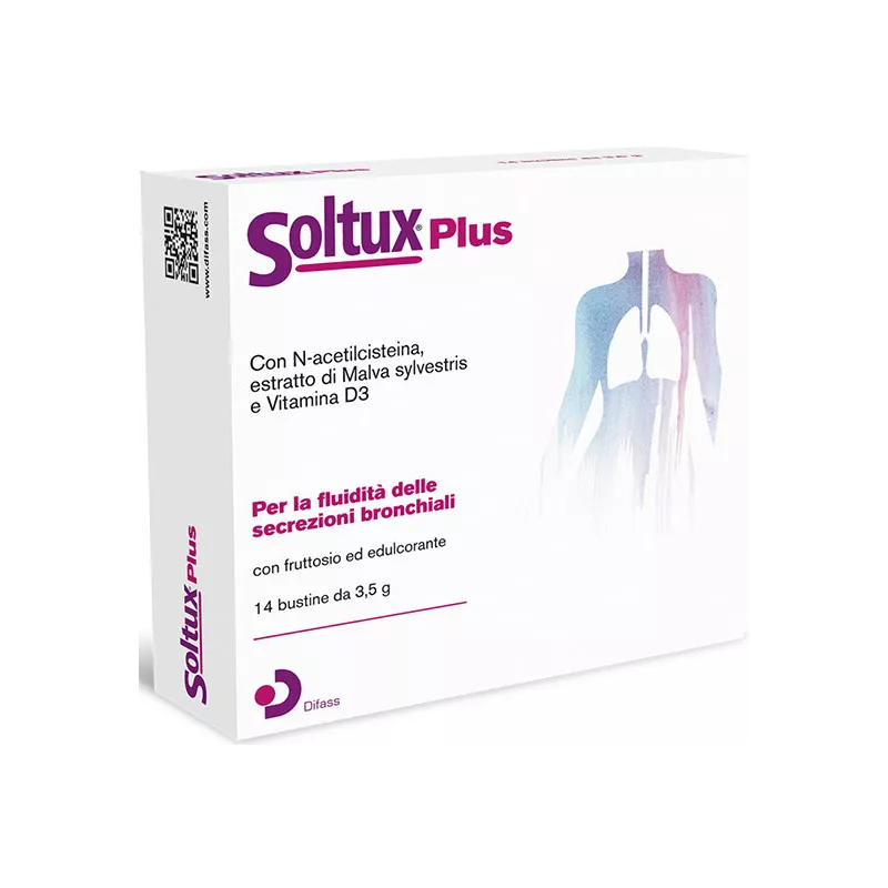 Soltux® Plus è un prodotto a base di N-acetilcisteina, estratto di Malva sylvestris e Vitamina D. L’estratto di Malva favorisce la fluidità delle secrezioni bronchiali, inoltre, ha un’azione emolliente e lenitiva utile per la funzionalità della mucosa orofaringea e favorisce il normale tono della voce. La Vitamina D contribuisce alla normale funzione del sistema immunitario.