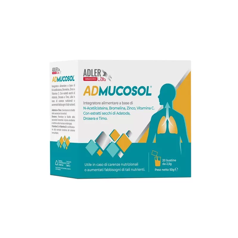 Ingredienti N-acetilcisteina; agente di carica: maltodestrine; agenti aggreganti: sorbitolo e xilitolo; bromelina gastroprotetta 5.000 GDU/g, adatoda (Justicia adhatoda L. foglie) e.s. tit. 0,5% alcaloidi, Drosera (Drosera rotundifolia L. erba con fiori) e.s. D/E:1/4, timo (Thymus vulgaris L. foglie) e.s. E/D:1/4, aroma, acido L-ascorbico; agenti stabilizzanti: mono e digliceridi degli acidi grassi, silice biossido; zinco citrato; edulcorante: sucralosio; coleclciferolo.