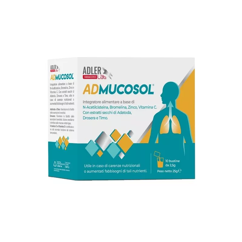 Ingredienti N-acetilcisteina; agente di carica: maltodestrine; agenti antiagglomeranti: sorbitolo e xilitolo; bromelina gastroprotetta 5.000 GDU/g, adatoda (Justicia adhatoda L. foglie) e.s. tit. 0,5% alcaloidi, drosera (Drosera rotundifolia L. erba con fiori) e.s. E/D:1/4, timo (Thymus vulgaris L. foglie) e.s. E/D:1/4, aroma, acido L-ascorbico; agenti stabilizzanti: mono- e digliceridi degli acidi grassi, silice biossido; zinco citrato; edulcorante: sucralosio; colecalciferolo.