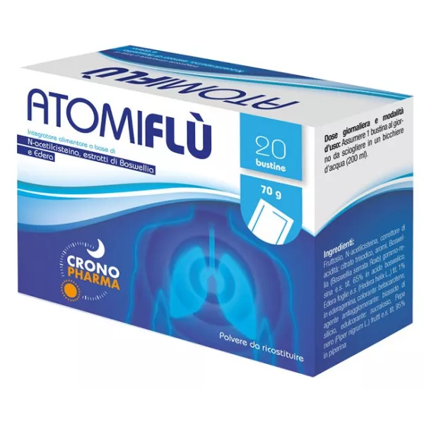 Ingredienti Fruttosio, N-acetilcisteina; correttore di acidità: citrato trisodico; aromi, boswellia (Boswellia serrata Roxb) gommo resina e.s. tit. 65% in acido boswellico, edera foglie e.s. (Hedera helix L.) tit. 1% in ederagenina; colorante: beta-carotene; agente antiagglomerante: biossido di silicio; edulcorante: sucralosio; pepe nero (Piper nigrum L.) frutti e.s. tit. 95% in piperina.