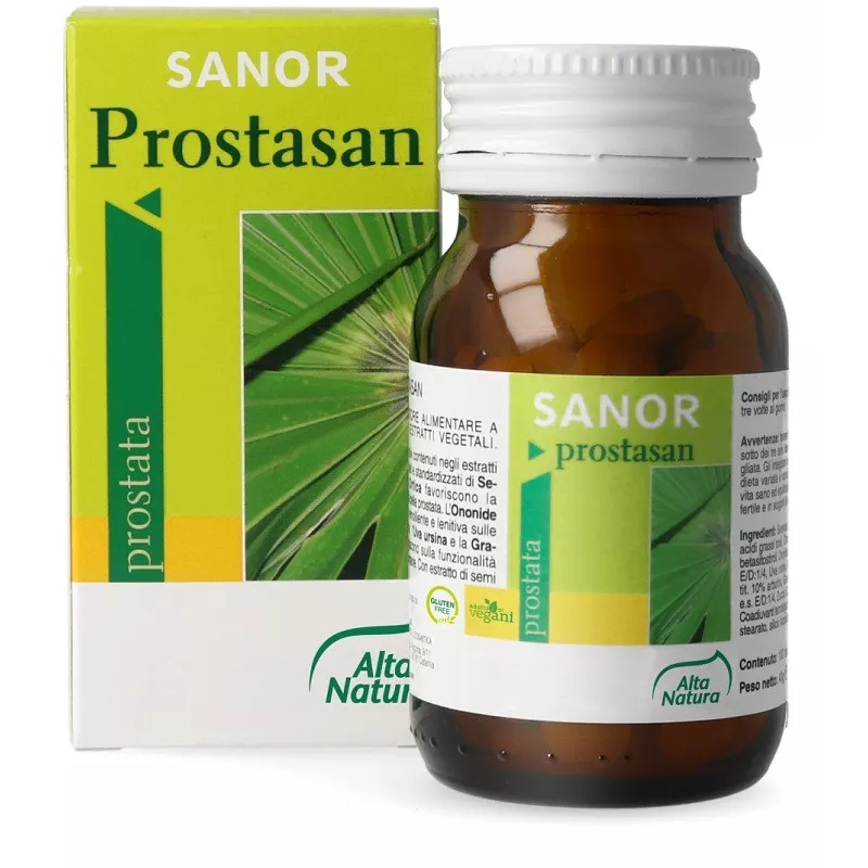 Sanor Prostasan, con i principi attivi contenuti negli estratti secchi titolati e standardizzati di Serenoa e ortica favoriscono la funzionalità della prostata. L'Ononide ha azione emolliente e lenitiva sulle vie urinarie, l'uva ursina e la gramigna agiscono sulla funzionalità delle vie urinarie. Con estratto di semi di zucca.